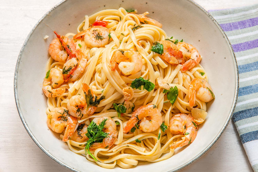 Prawn pasta with a garlic, butter and white wine sauce, and a hint of chilli